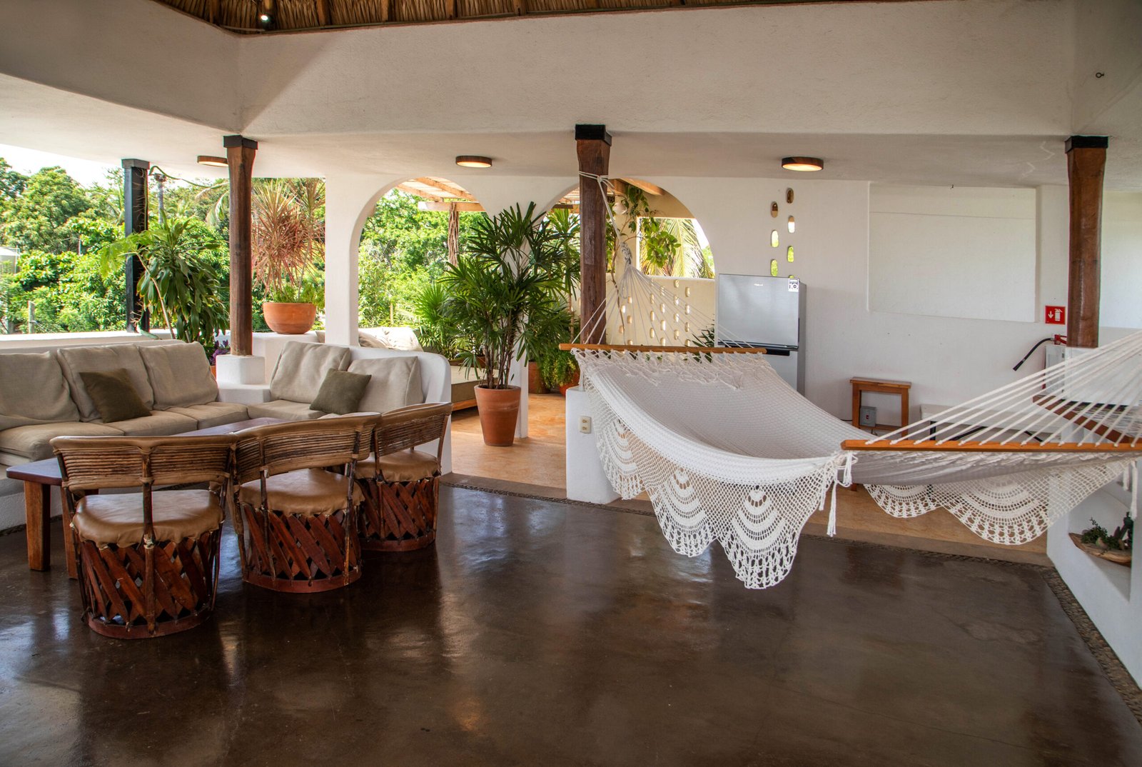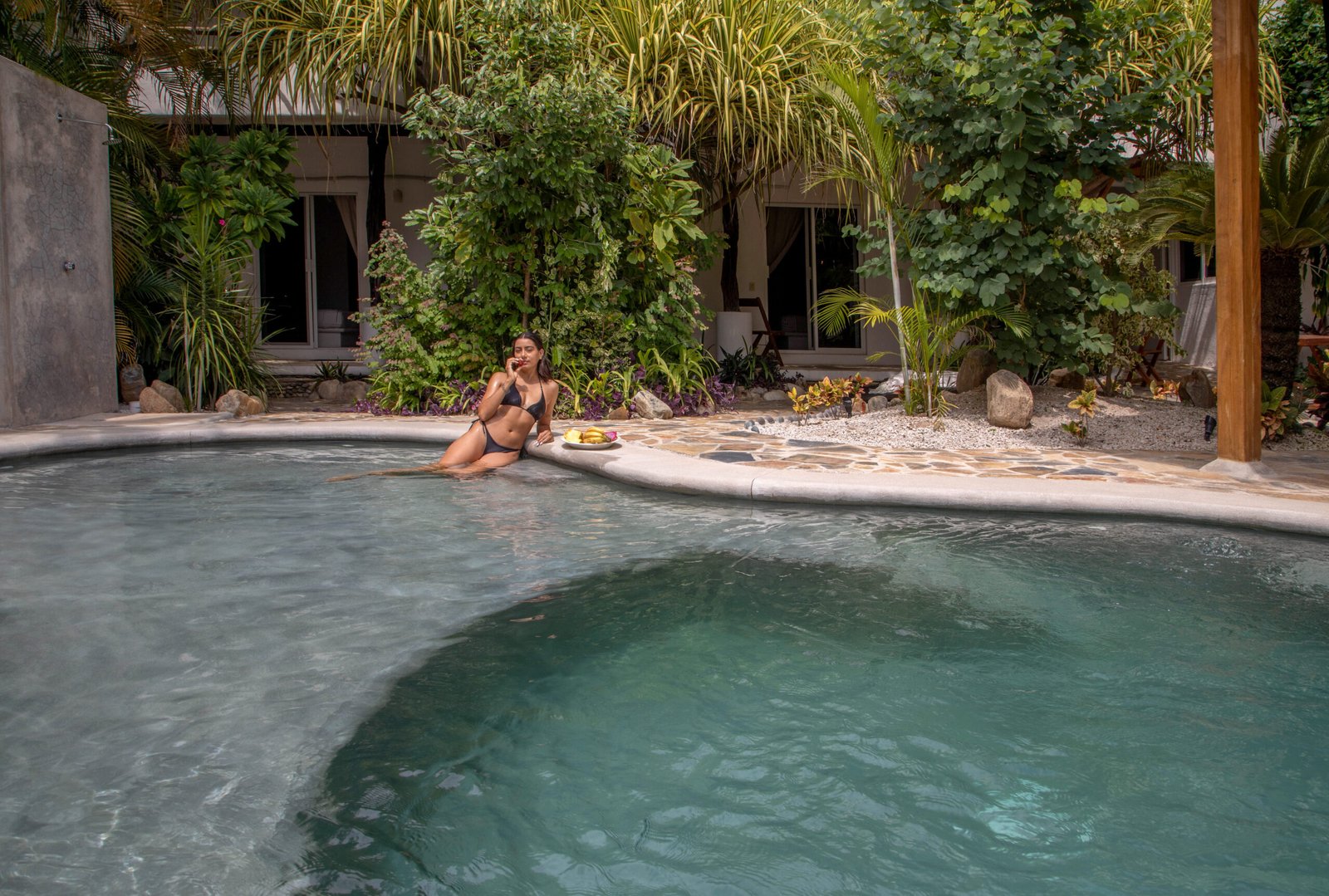 The most dramatic change happened in the area that previously housed a covered gym. Aimed at attracting leisure travelers, we designed an organically shaped pool area surrounded by lush greenery, featuring a built-in concrete sofa with weather-resistant upholstery and a color palette consistent with the rest of the project. A pergola with hammocks and loungers was added, creating a laid-back, inviting space entirely different from what existed before.