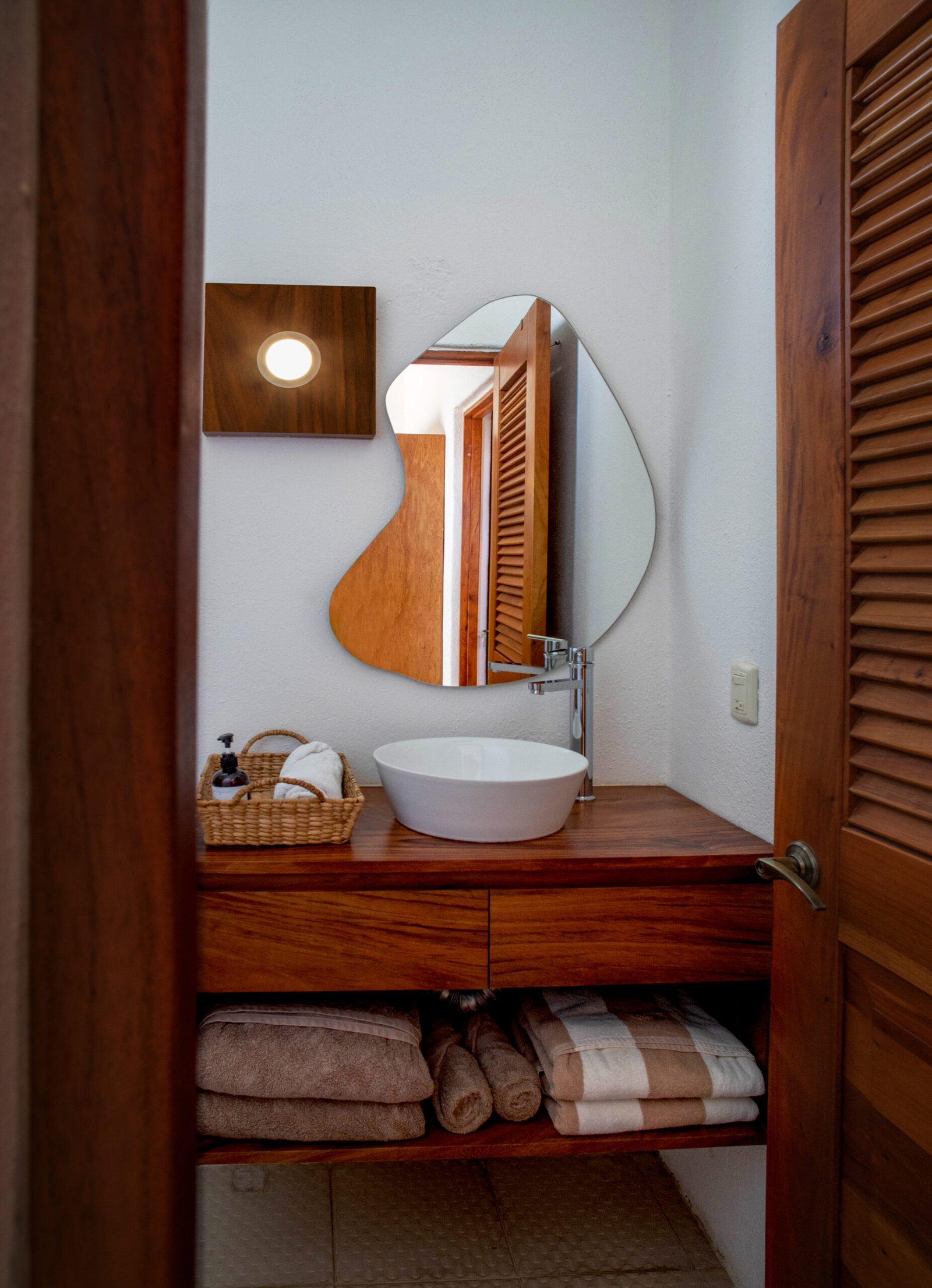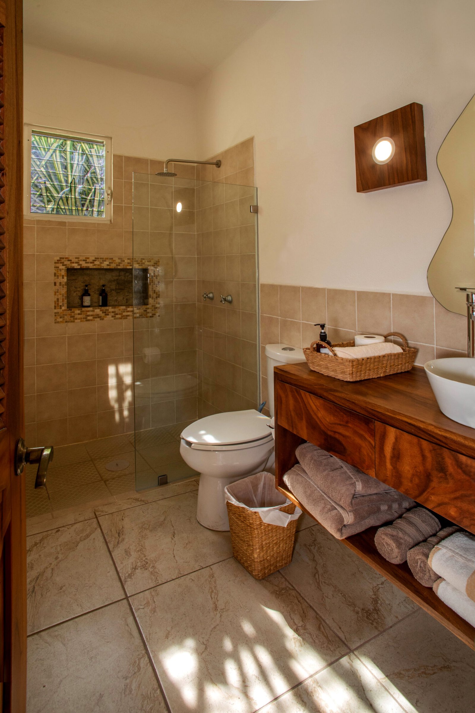 The rooms, functioning as small apartments, retained part of their original furniture. We introduced new curtains, natural textiles, and locally handcrafted fiber decor to create a warmer, more coastal vibe. Decorative cushions were added, existing elements rearranged, and a simple TV shelf was designed and installed in each room. In the bathrooms, we updated the shower enclosures, installed new under-sink cabinets, basins, organic-shaped mirrors, ambient lighting, and fiber baskets that bring both function and charm.