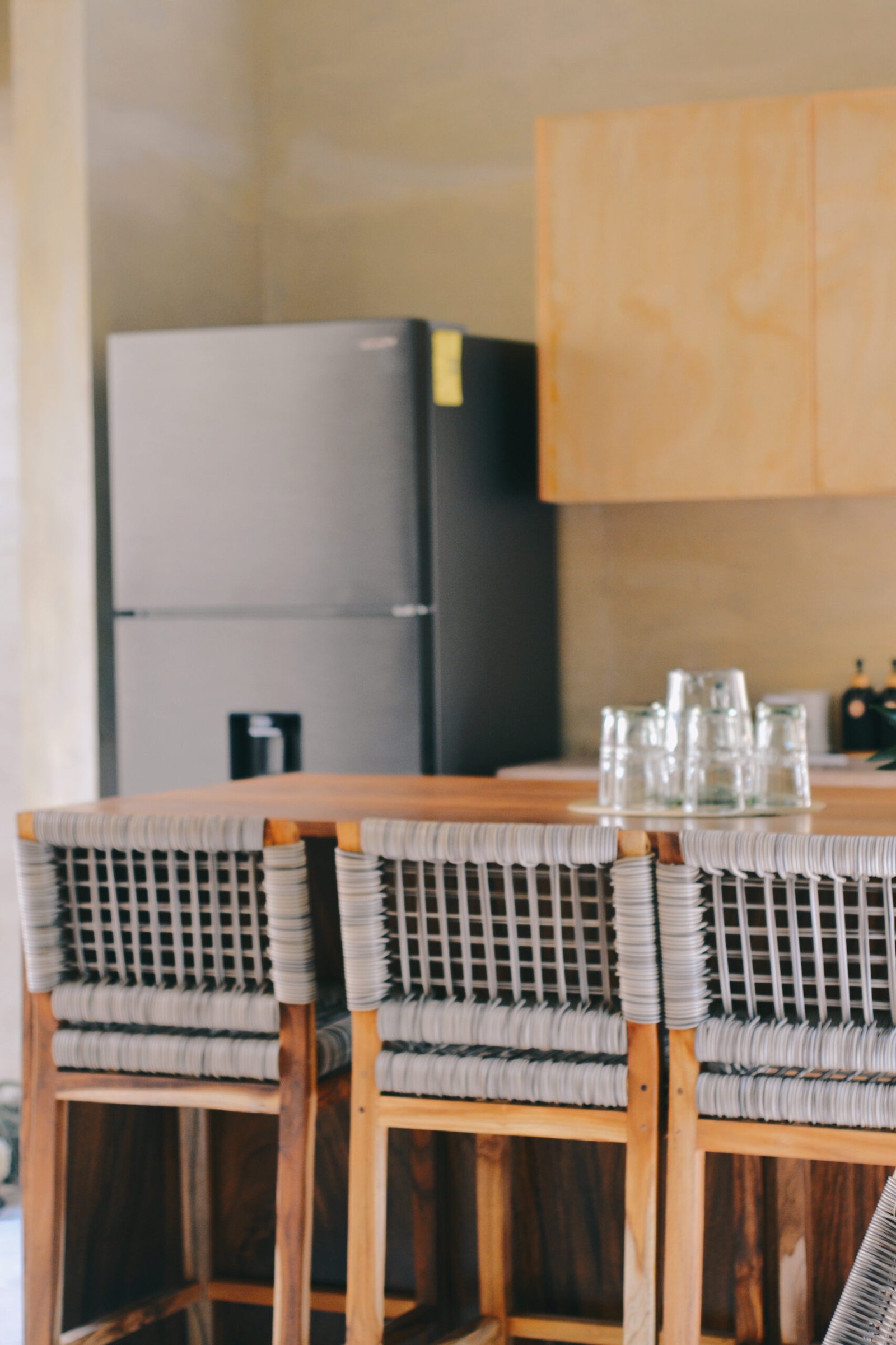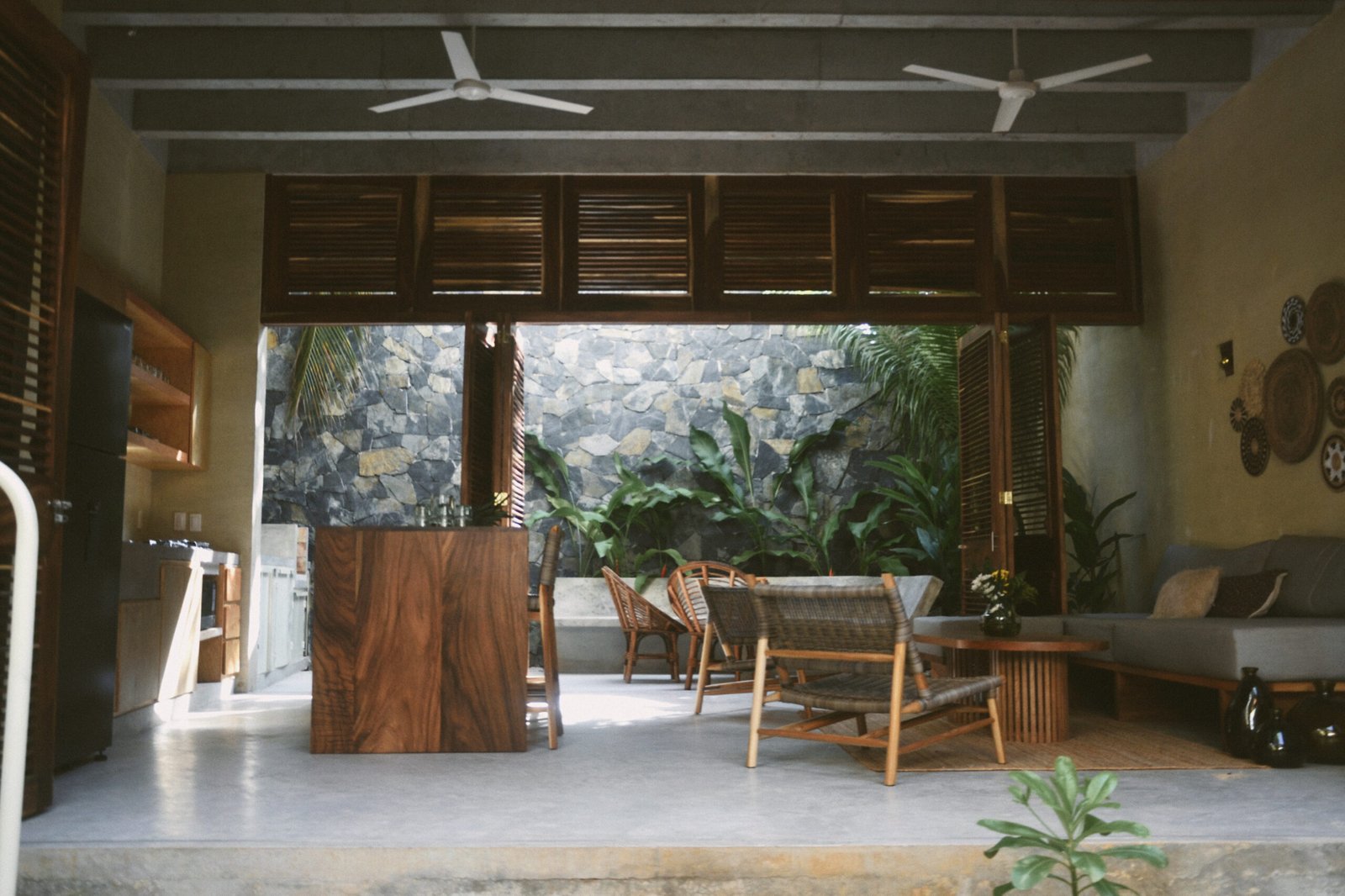 For this project, we used macuil wood for movable furniture and lightweight design elements, while parota was chosen for more structural pieces like the kitchen island. The color palette—soft and desaturated—was selected in collaboration with the client, who also contributed personal decorative items. We handled the final styling, placing each piece with care to create a fresh, harmonious, and character-rich environment.