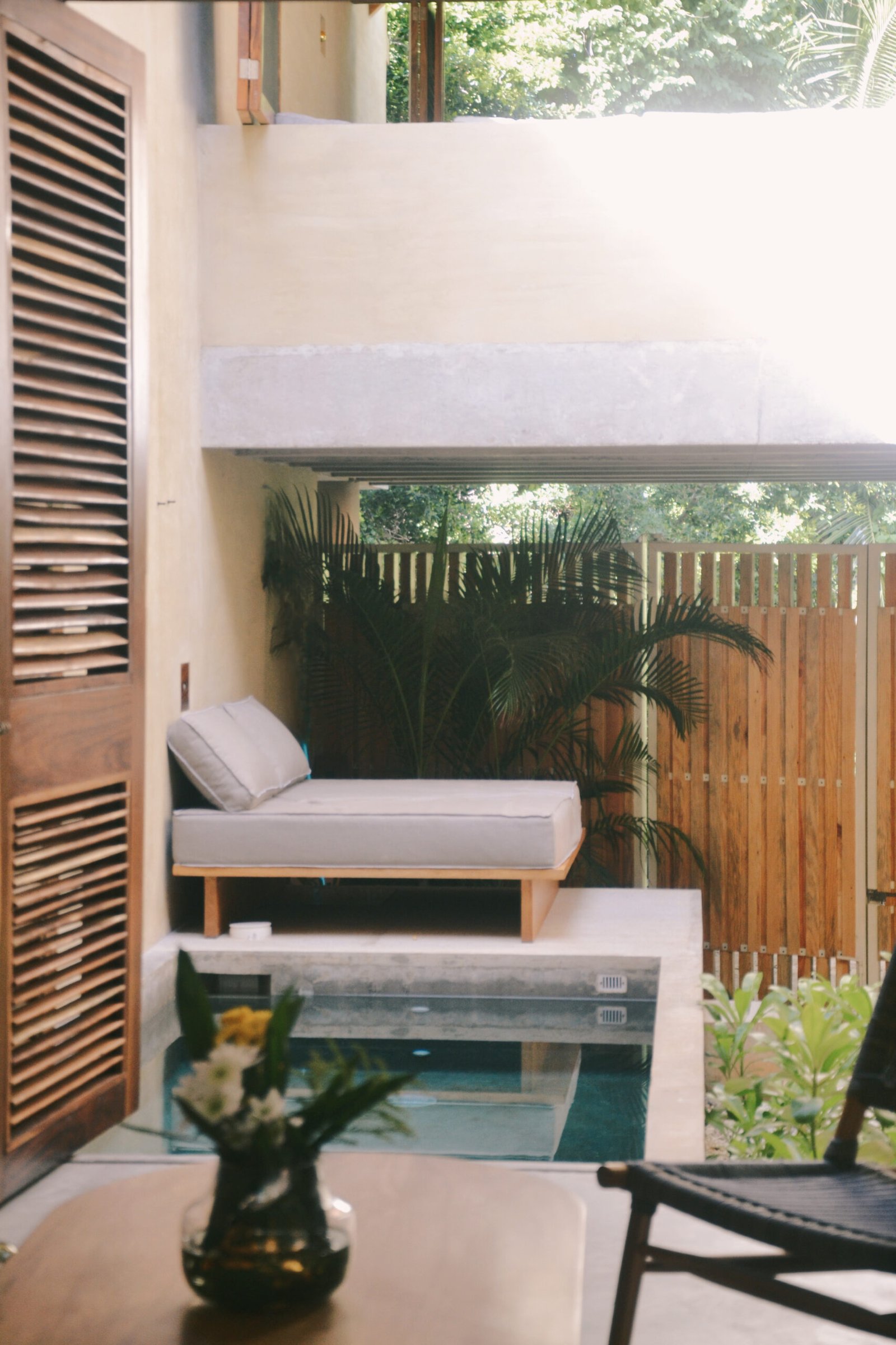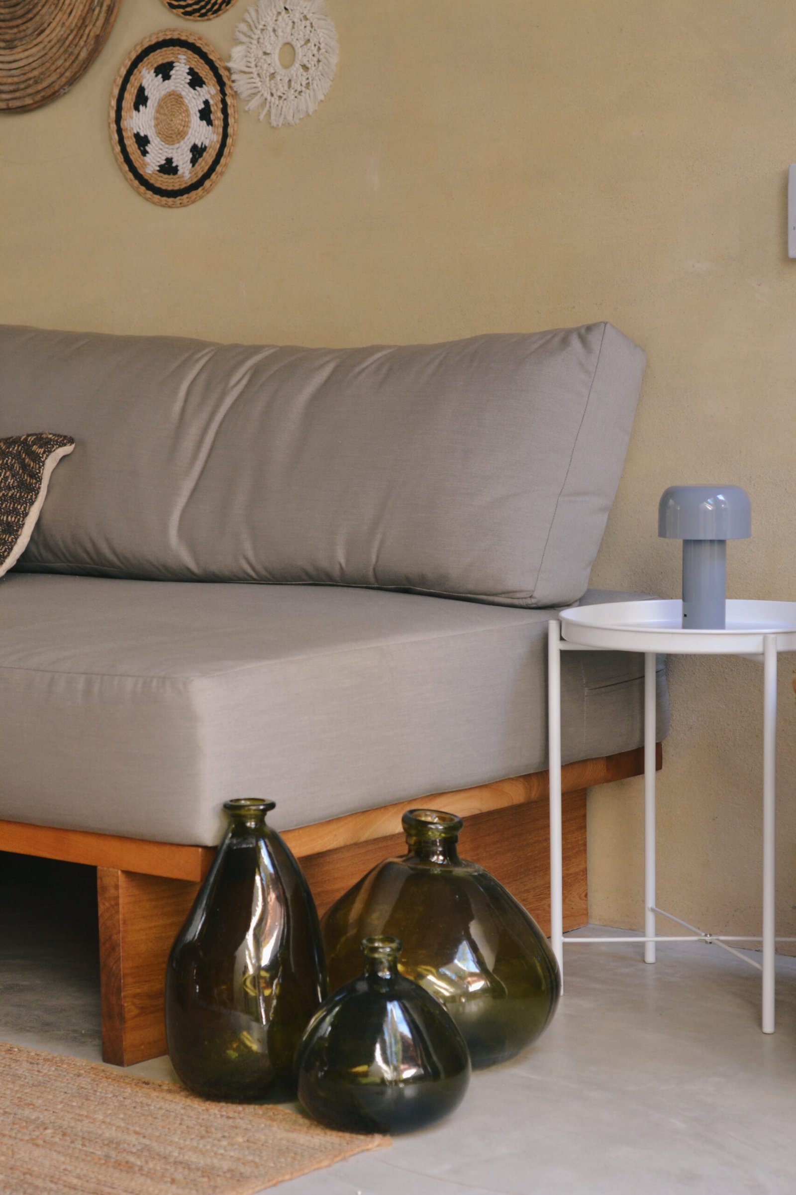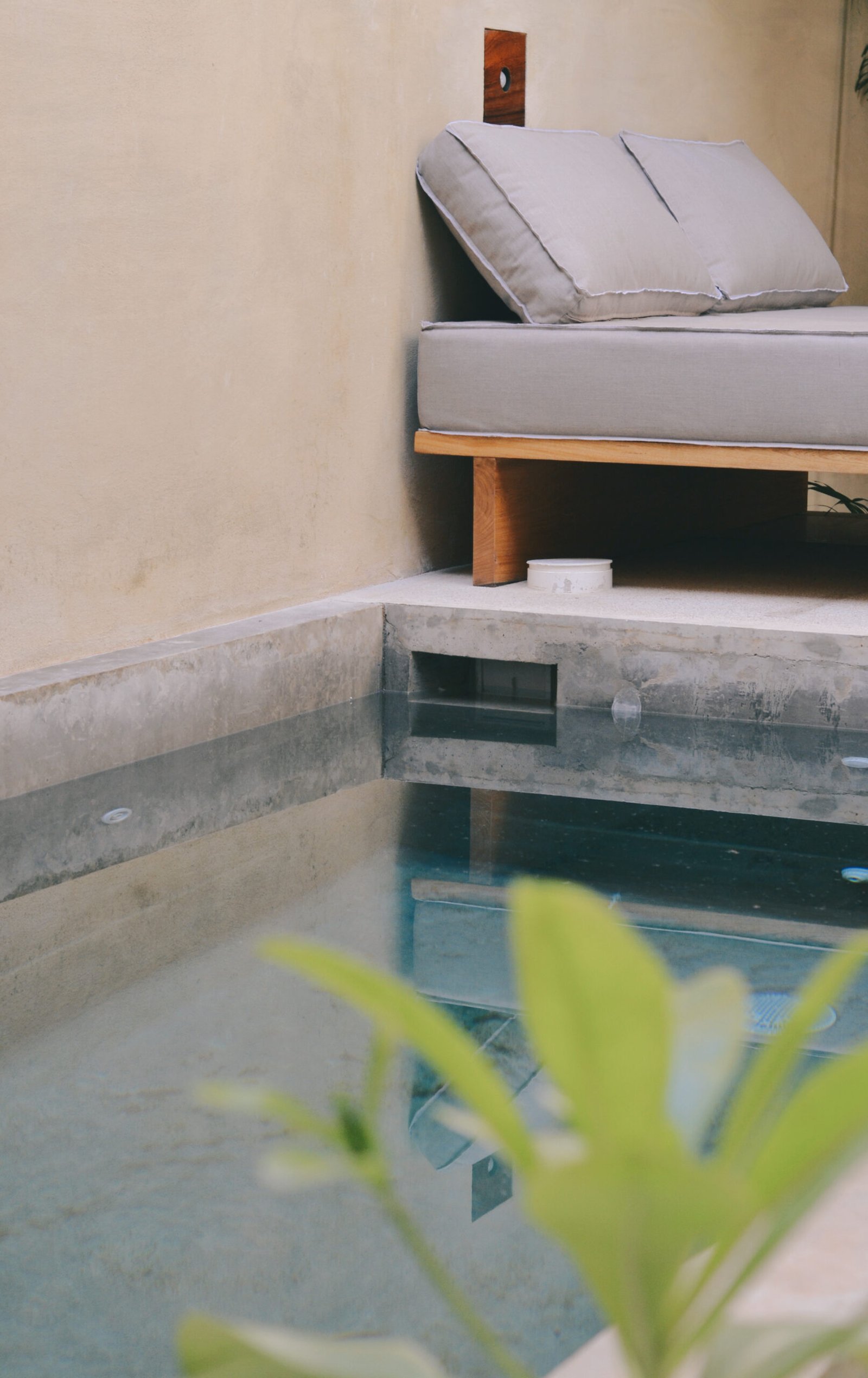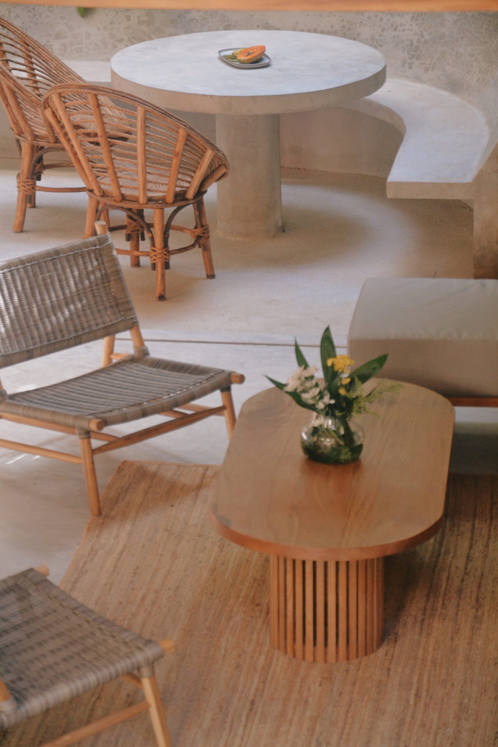 In the outdoor area, we designed a custom sunbed in macuil wood with a simple yet elegant structure, intended for poolside relaxation. The outdoor cushions, specially made for the project, rest against a built-in wall structure, offering enhanced comfort and a clean visual integration. This design is echoed in the indoor living room sofa, creating continuity between indoor and outdoor spaces. It features a solid wood base, cozy cushions, and an oval coffee table whose wooden legs showcase a delicate slatted effect—an artisanal detail that recurs throughout the furniture to ensure visual unity and handcrafted character.